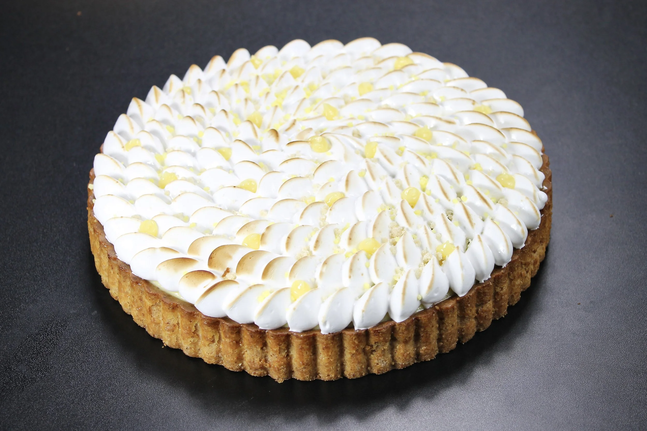 Pate sable tart dough. Lemon cremeux, lemon curd, lemon-mint confit. Topped with Italian meringue.