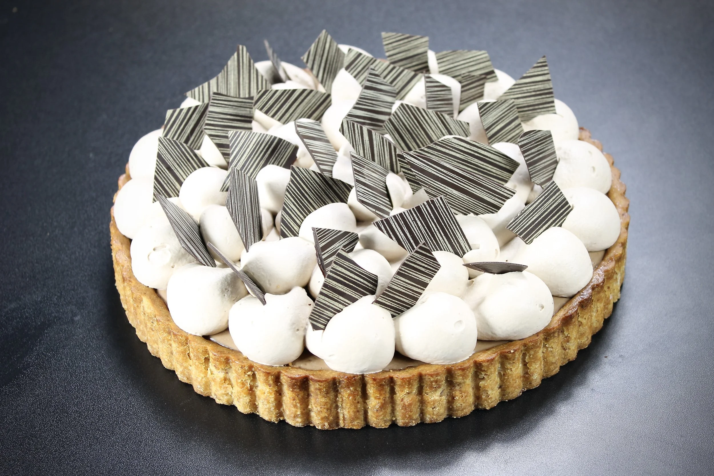 Pate sable tart dough. Chocolate frangipane, 64% Equatorian chocolate cream. Topped with milk chocolate whipped cream and crispy chocolate chards.